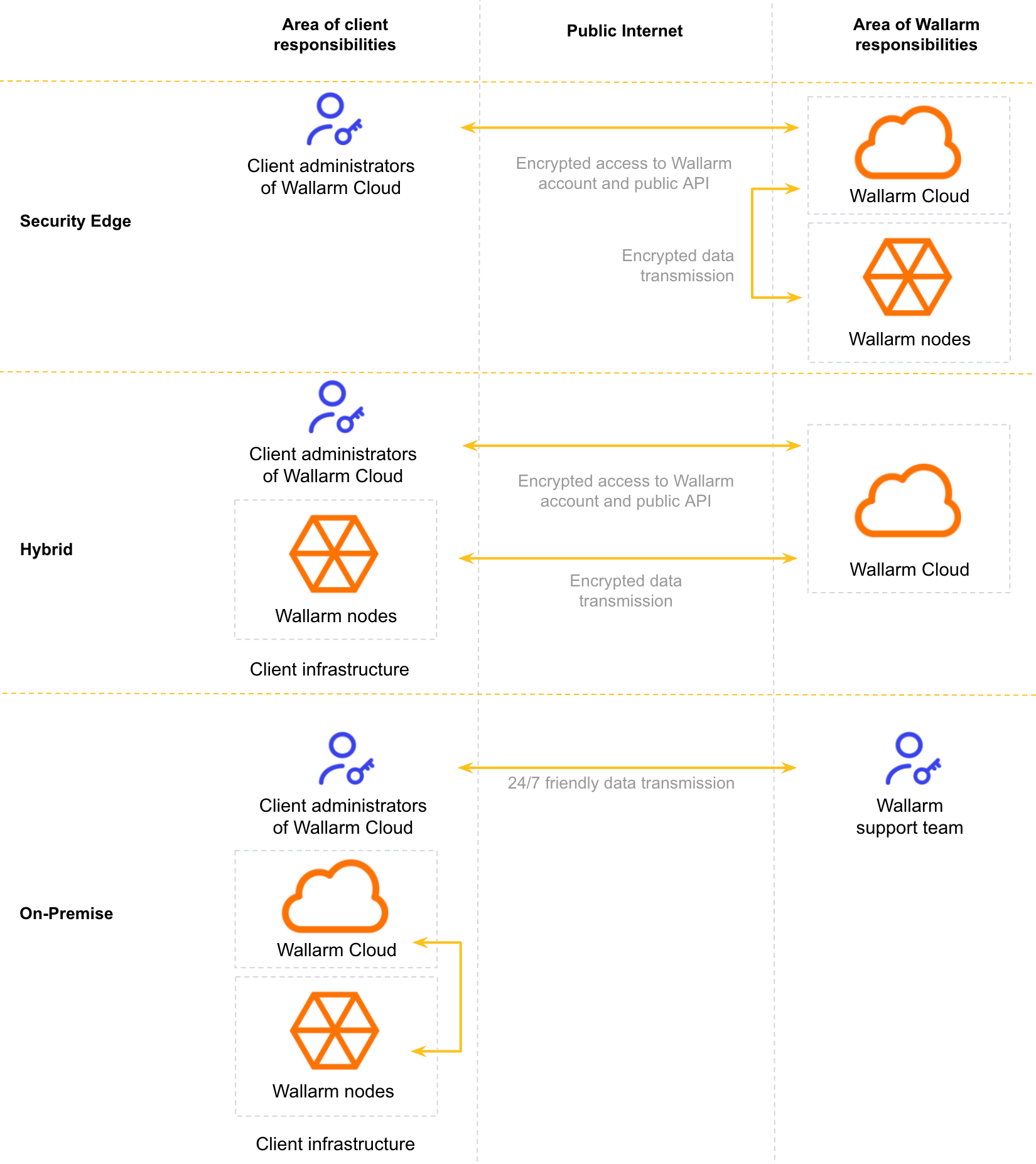 Hybrid: Wallarm clients deploy and manage the Wallarm filtering nodes, and Wallarm manages the Wallarm Cloud component.
