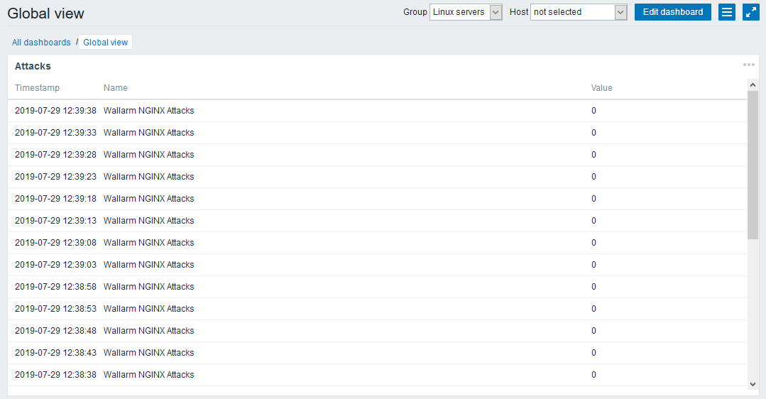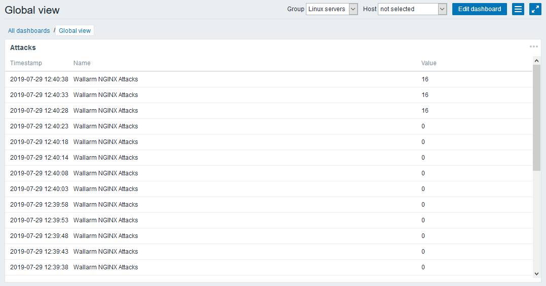 wallarm-statusoutput and the Zabbix widget:{"requests":64,"attacks":16,"blocked":0,"abnormal":64,"tnt_errors":0,"api_errors":0,"requests_lost":0,"segfaults":0,"memfaults":0,"softmemfaults":0,"time_detect":0,"db_id":46,"custom_ruleset_id":4,"proton_instances": { "total":2,"success":2,"fallback":0,"failed":0 },"stalled_workers_count":0,"stalled_workers":[] }