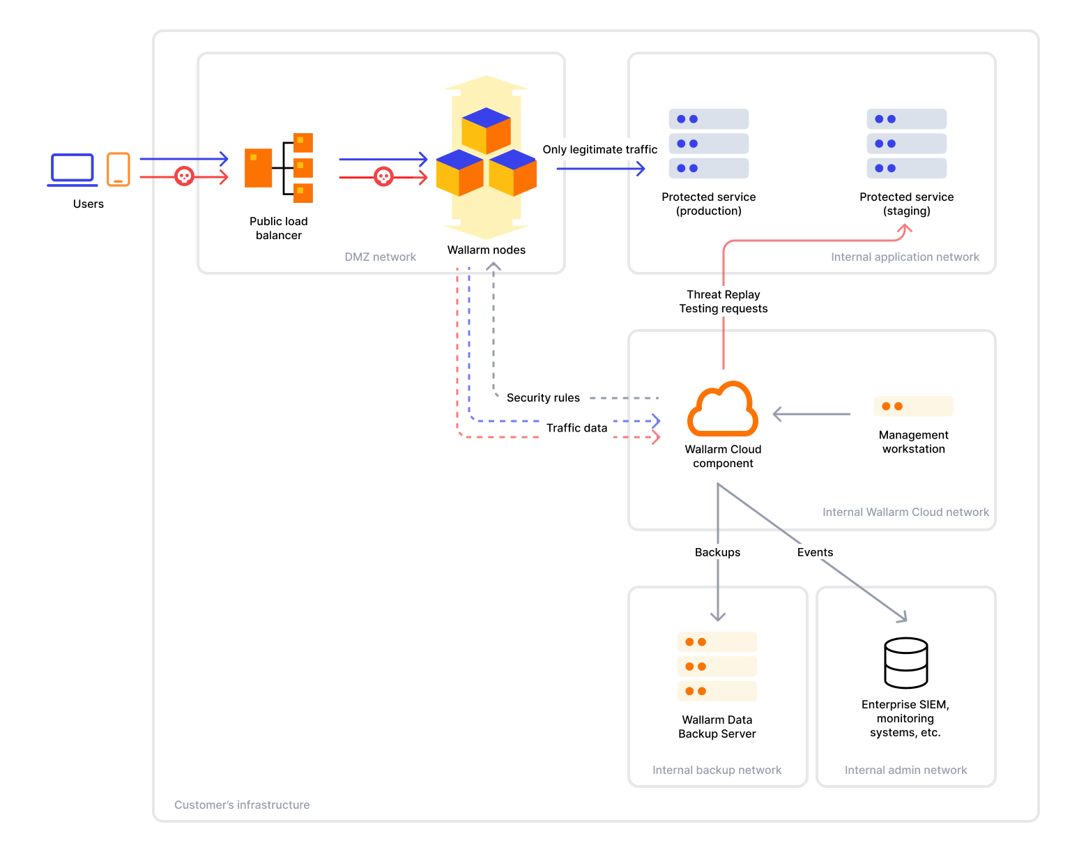 Wallarm offers an on-premises solution tailored for partners, large enterprises, and any organization that requires complete control over their security infrastructure. This deployment model enables hosting both Wallarm Filtering Nodes and the Wallarm Cloud component entirely within your environment.