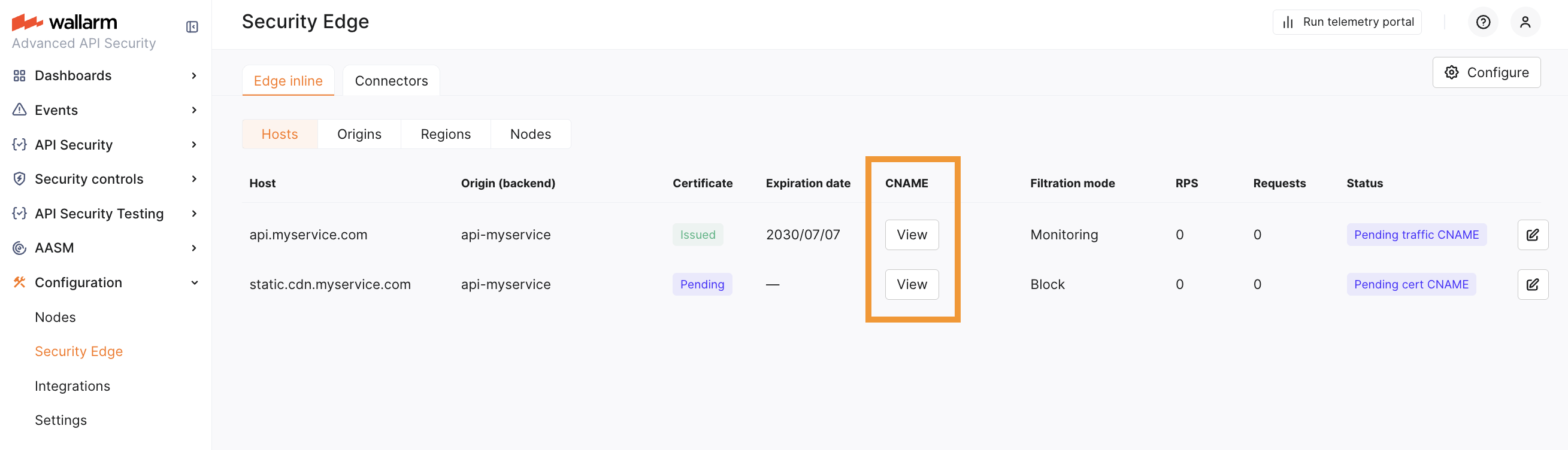 Once the certificate CNAME is verified, a Traffic CNAME is available for each host. If no certificate is issued, the CNAME is available immediately after the configuration is complete.