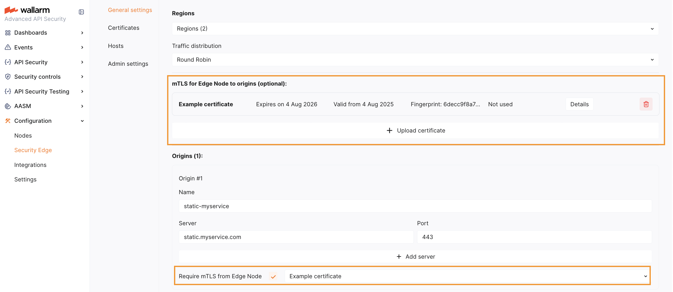 In the Origins section, enable Require mTLS from Edge Node for the relevant origin and select the appropriate certificate.