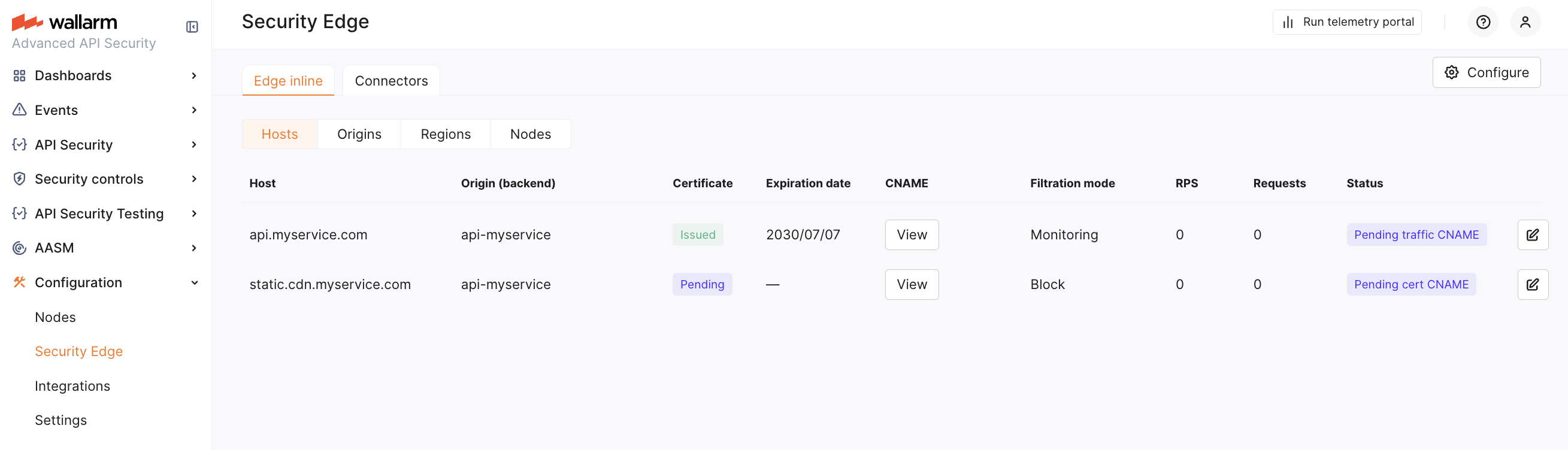 Deployment failed: The Edge Node deployment did not succeed, e.g. due to the certificate CNAME not added within 14 days. Check configuration settings and try to redeploy or contact the Wallarm Support team to get help.