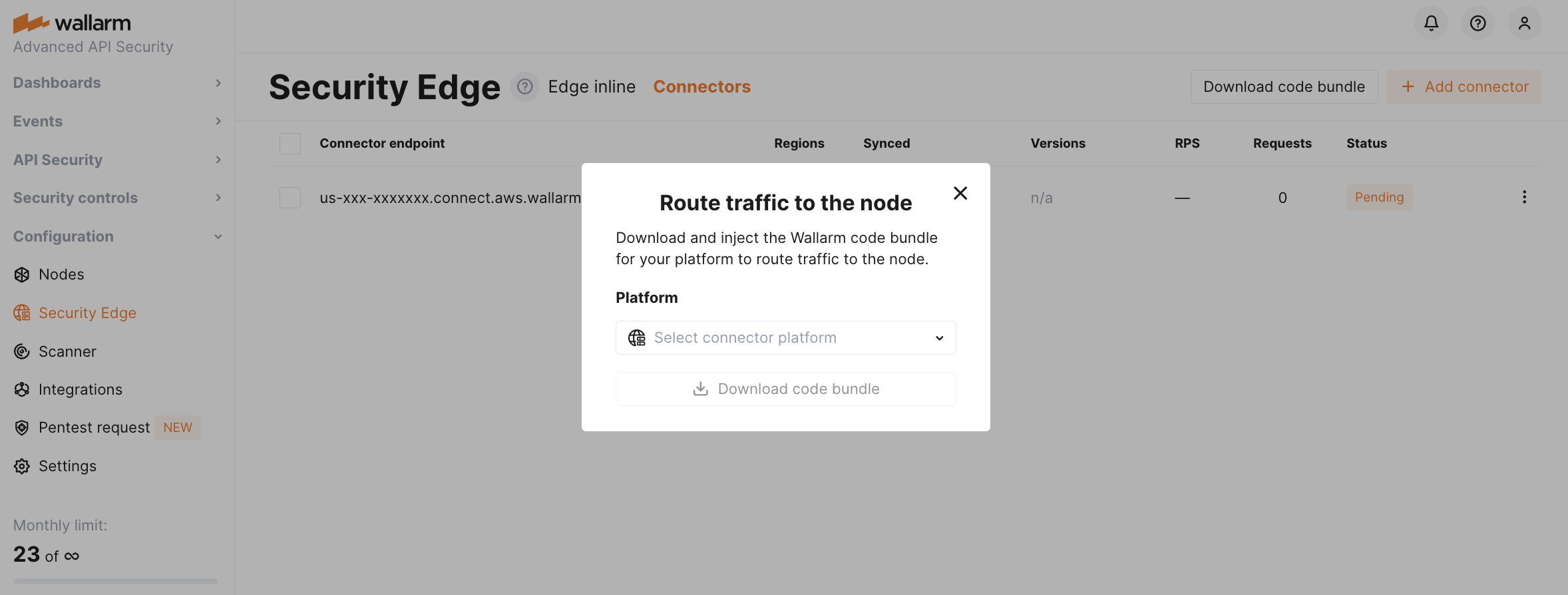 To run the Security Edge Connector, go to the Wallarm Console → Security Edge → Connectors → Add connector. If this section is unavailable, contact sales@wallarm.com to access the required subscription.