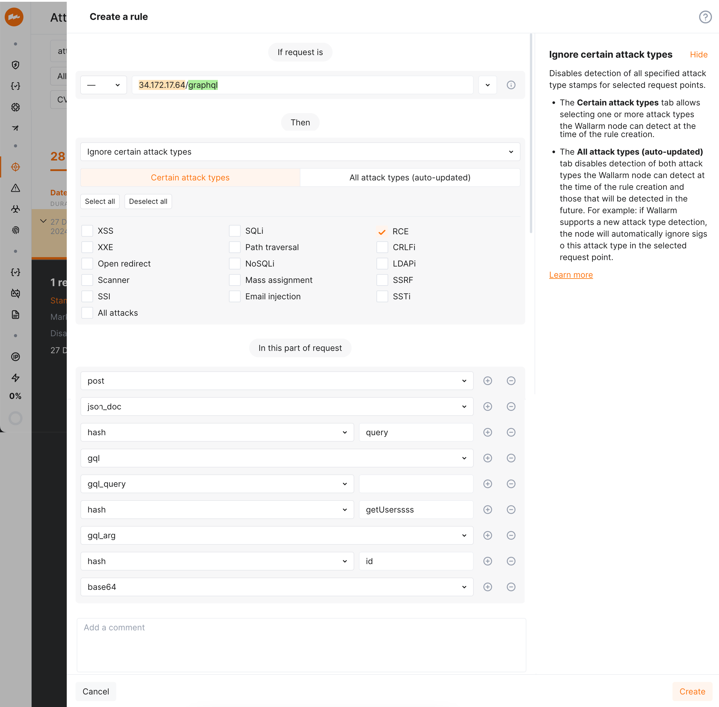 Advanced rule application: apply granular protection rules to specific GraphQL request parts. This enables fine-tuning and configuring exclusions for certain attack types in defined parts of GraphQL request.