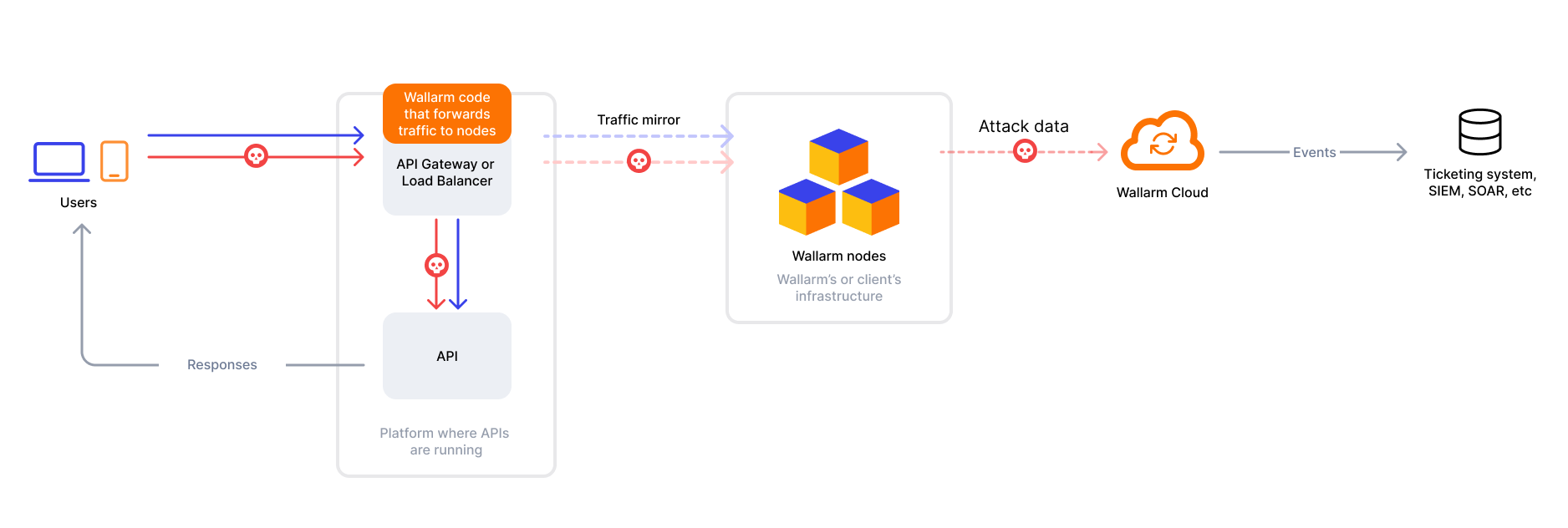 Wallarm's connector solution integrates with third-party platforms, such as API gateways or edge platforms, to filter and analyze traffic. The solution operates with two main components: