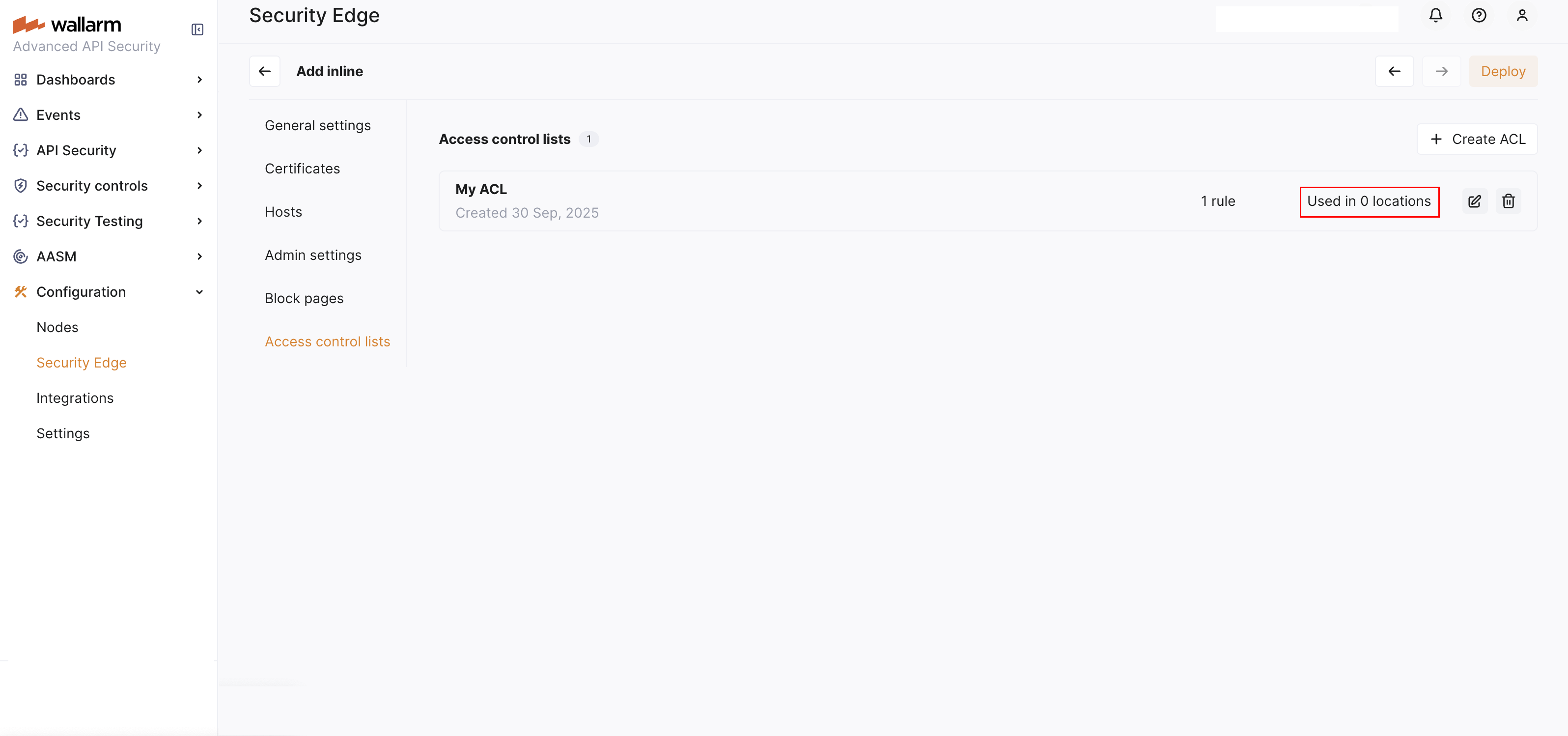 Go to Wallarm Console → Security Edge → Inline → Configure → Access control lists and click Create ACL.