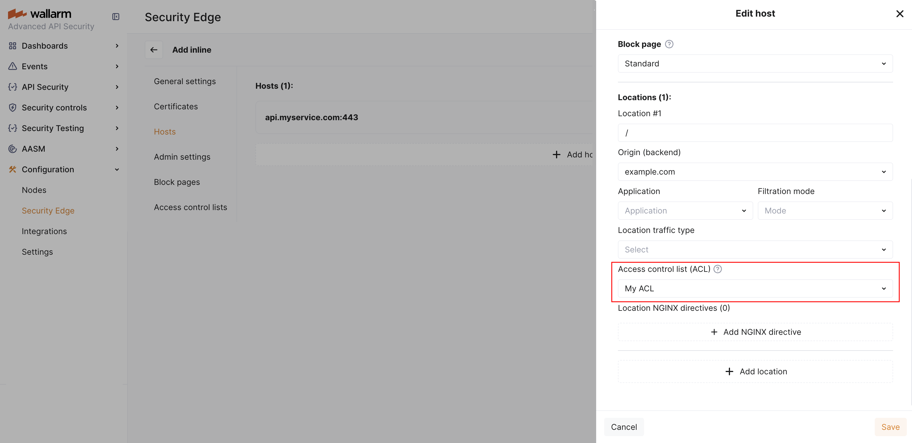 An access control list (ACL) is a set of rules that defines which IP addresses can access specific hosts and locations of your APIs protected by Security Edge Inline.