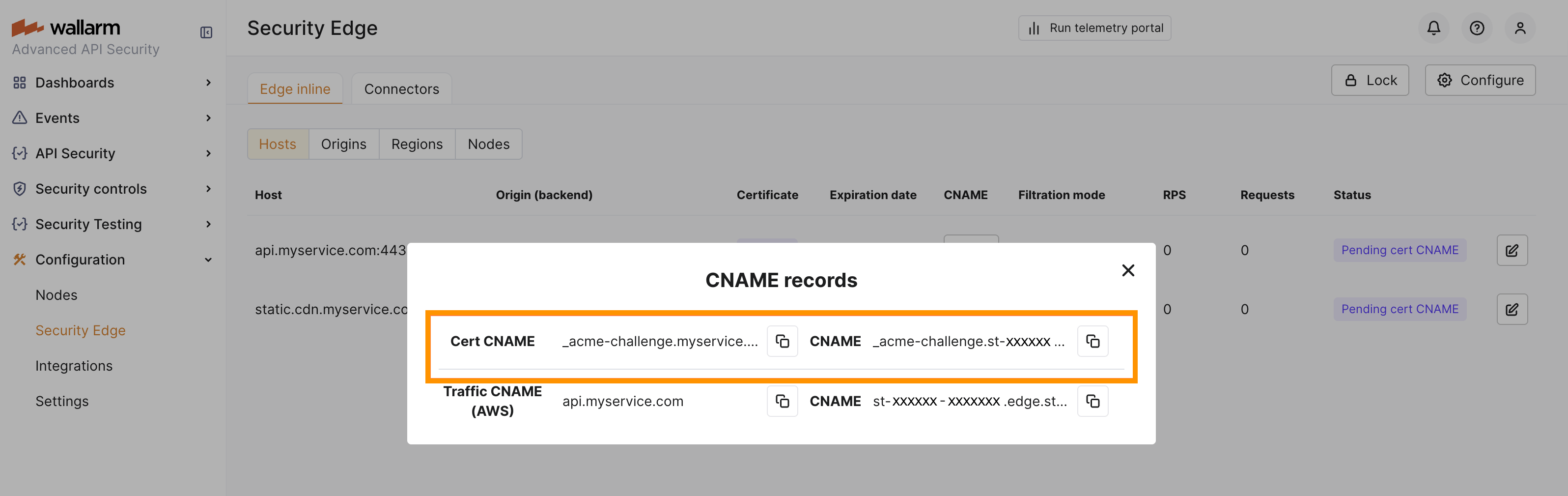 DNS changes can take up to 24 hours to propagate. Wallarm starts the Edge Node deployment once the CNAME records are verified (if needed).